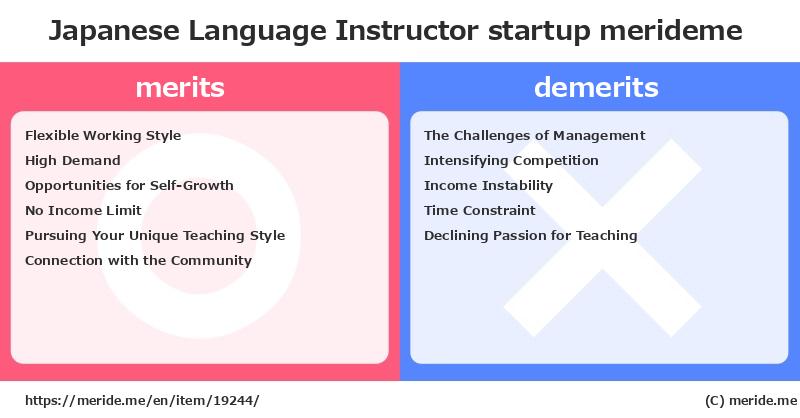 Starting a business can also lead to a diminishing passion for education. In the rush of management and customer acquisition, teaching can become secondary. What was once enjoyable in teaching may turn into mere duties, which could cause you to lose sight of yourself over time.There are numerous advantages to starting a career as a Japanese Language Instructor. Firstly, it serves as a job with international influence, allowing you to play a valuable role in spreading Japanese culture and language. Additionally, there are endless learning opportunities, as you can gain new perspectives and knowledge through interactions with your students. Furthermore, you can achieve a flexible working style by choosing online classes or freelance activities, enabling you to work in a way that suits your lifestyle.