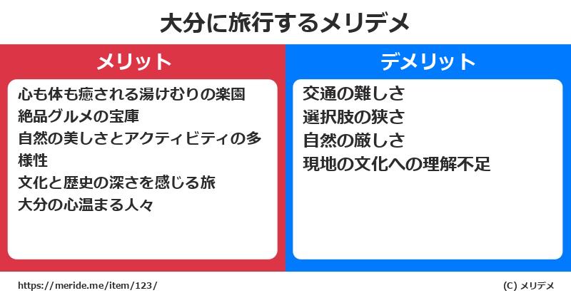 一方、大分に旅行するデメリットとして、時期によっては天候が不安定で、雨に降られることもあります? その際、計画していた観光ができなくなる可能性もあるんです……。また、混雑するシーズンだと宿や交通手段が取りづらくて、欲求不満になっちゃいます! どうしてもストレスが溜まりそうですね。旅行前にしっかり計画を立てる必要がありますが、その分、楽しい思い出ができることも期待できるので、心の準備をしなくちゃ!